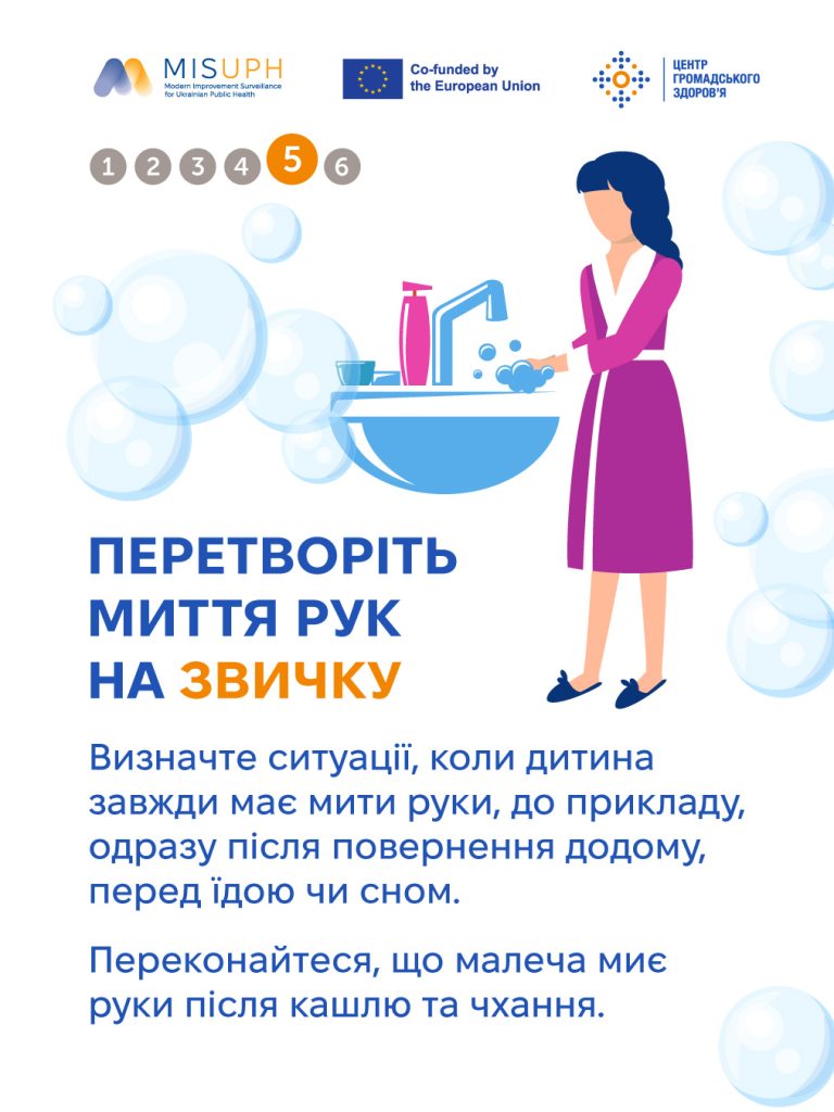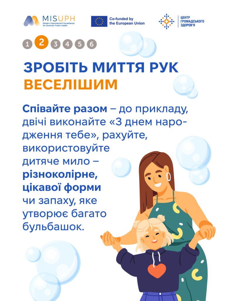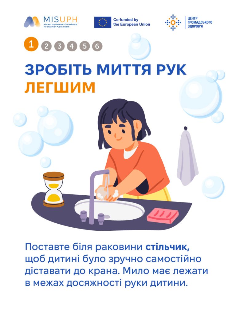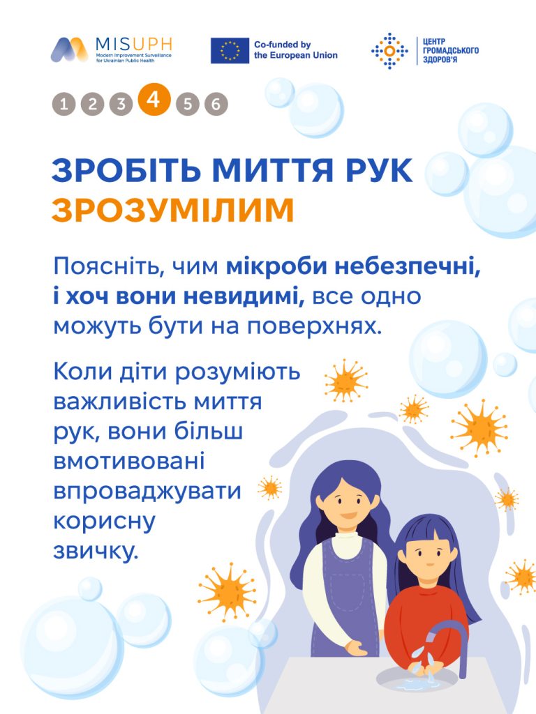 Розкажіть зрозумілими для дитини словами, що миття рук захищає її та близьких від небезпечних бактерій і вірусів.