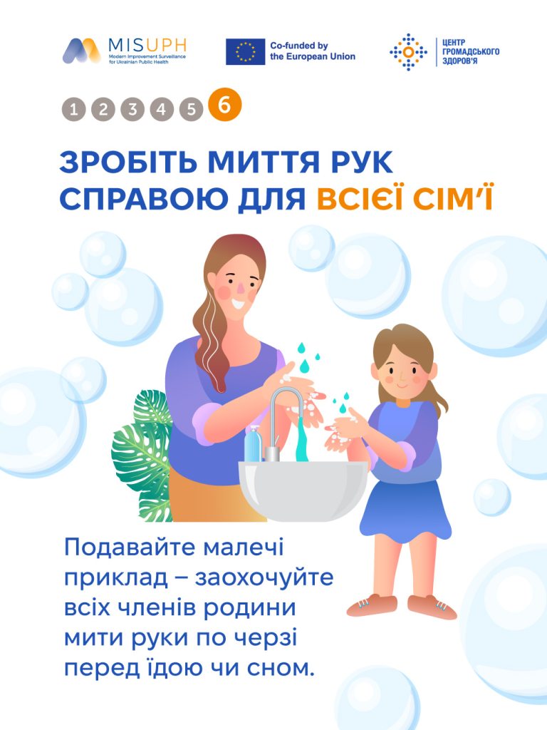 Будьте прикладом для малечі — заохочуйте всіх членів родини мити руки щоразу перед їдою чи сном!