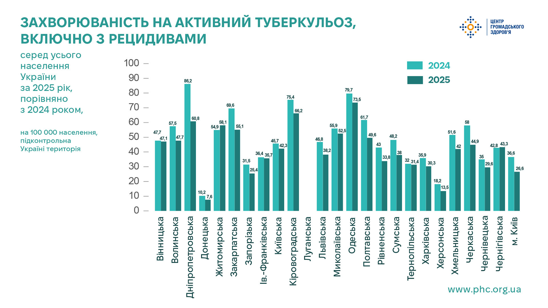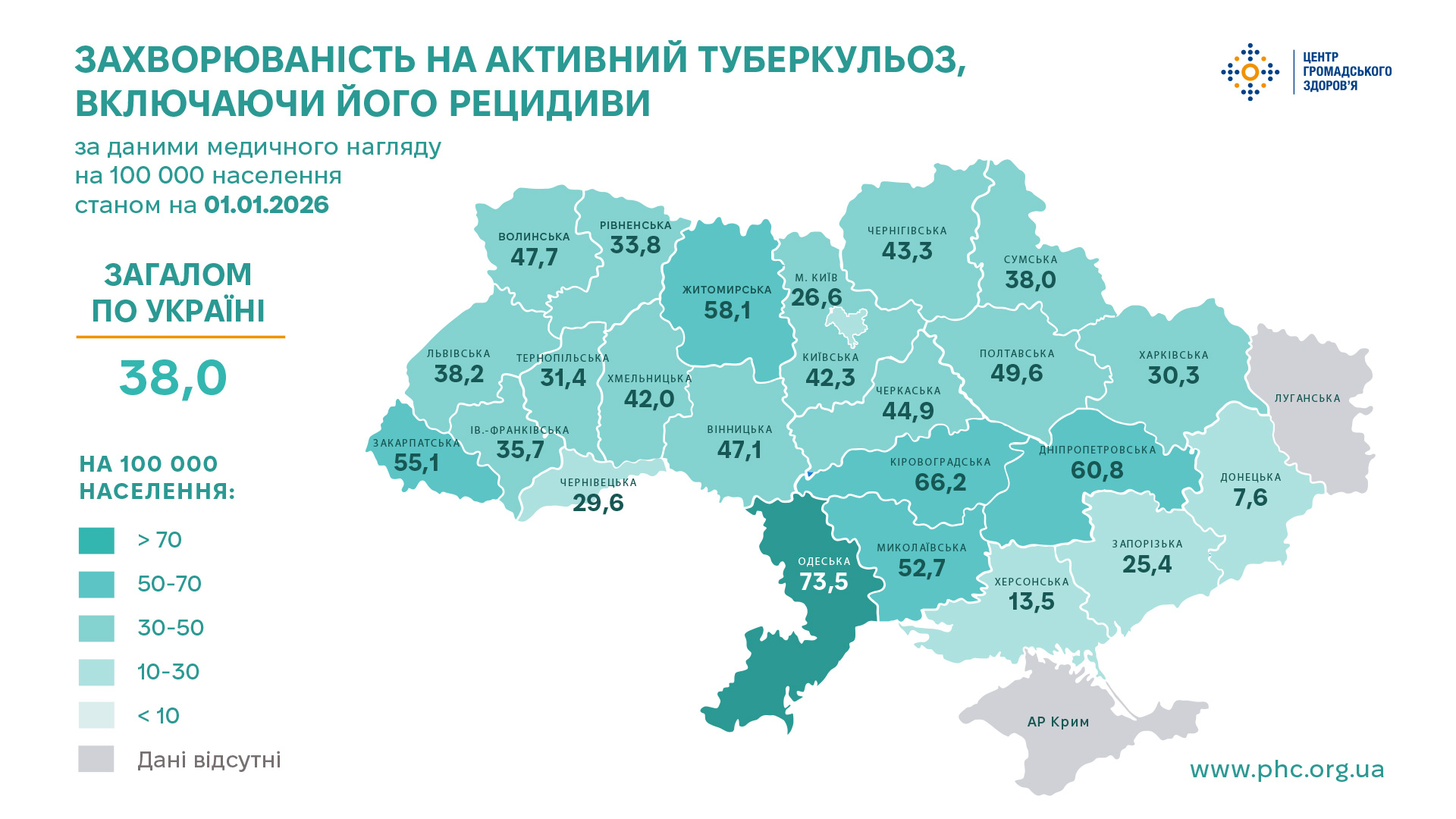 За даними ДУ «Центр громадського здоров’я Міністерства охорони здоров’я України» у 2025 році кількість уперше зареєстрованих в Україні захворювань на туберкульоз (ТБ), включно з його рецидивами, становила 15 564 випадків, або 38,0 на 100 000 населення*, що на 14% менше аналогічного показника 2024 року (18 140, або 44,2 на 100 000 населення*).