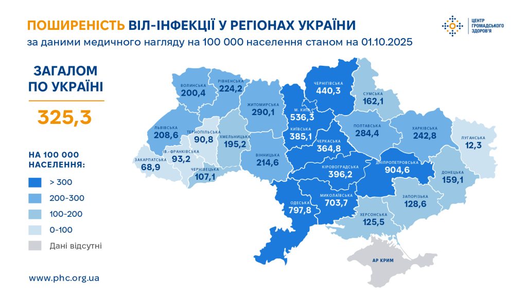 Станом на 01.10.2025 року у закладах охорони здоров’я під медичним наглядом перебувало 133 382 людей, які живуть з ВІЛ, що становить 325,3 на 100 000 населення За даними офіційної реєстрації найвищій рівень поширеності ВІЛ-інфекції на 100 000 населення зареєстрований, як і в попередній період, в Дніпропетровській (904,6), Одеській (797,8), Миколаївській (703,7) областях та у м. Київ (536,3). У порівнянні з 9 місяцями 2024 року диспансерна група по Україні зменшилася на 9,6%, така тенденція спостерігається в 13 областях: Одеській (Тпр-17,9%), Чернівецькій (Тпр-15,4%), м. Київ (Тпр-15,0%). В областях, які частково тимчасово окуповані, негативний приріст значно більше: Луганська (Тпр-77,0%), Херсонська (Тпр-66,5%), Донецька (Тпр-29,0%).